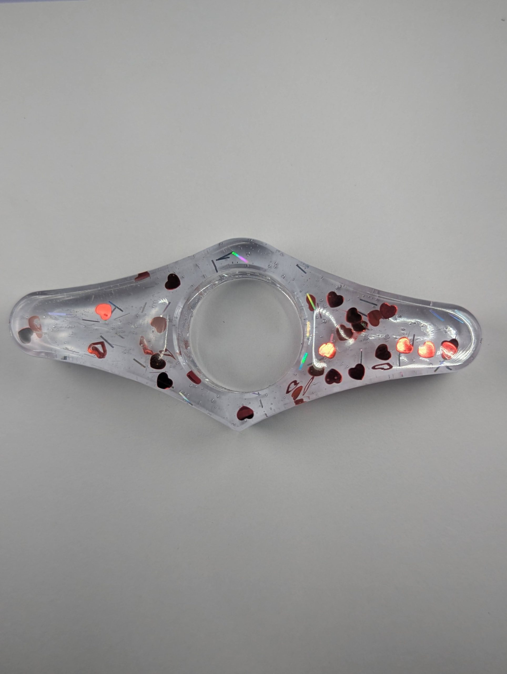 A clear resin page holder accented with metallic red hearts and holographic sparkle flakes. Cute and perfect for gifting.