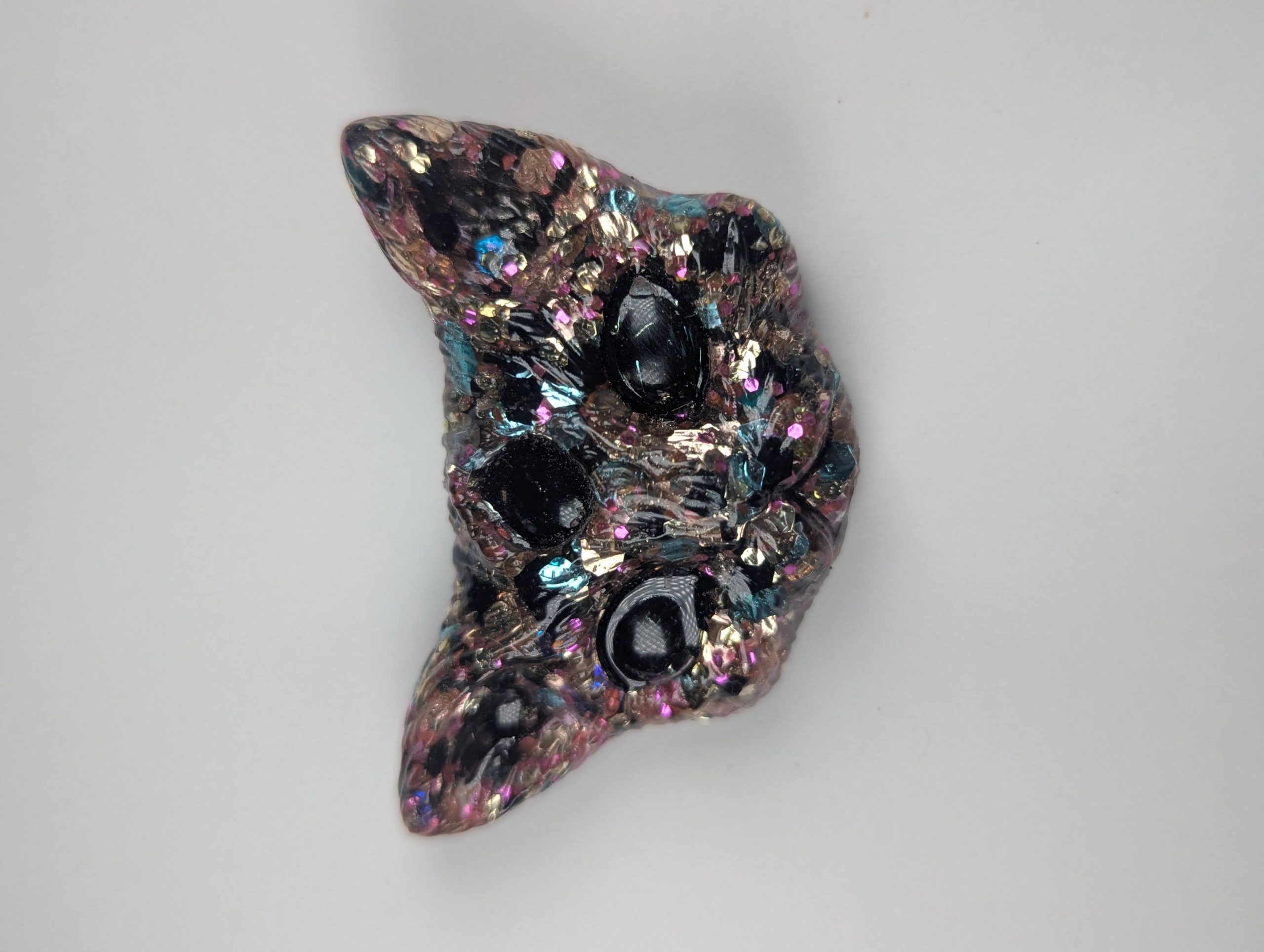 A handcrafted resin magnet shaped like a cat face, packed with multicolor glitter flakes and glossy black eyes. Unique, bold, and perfect for decorating fridges, lockers, or craft spaces.
