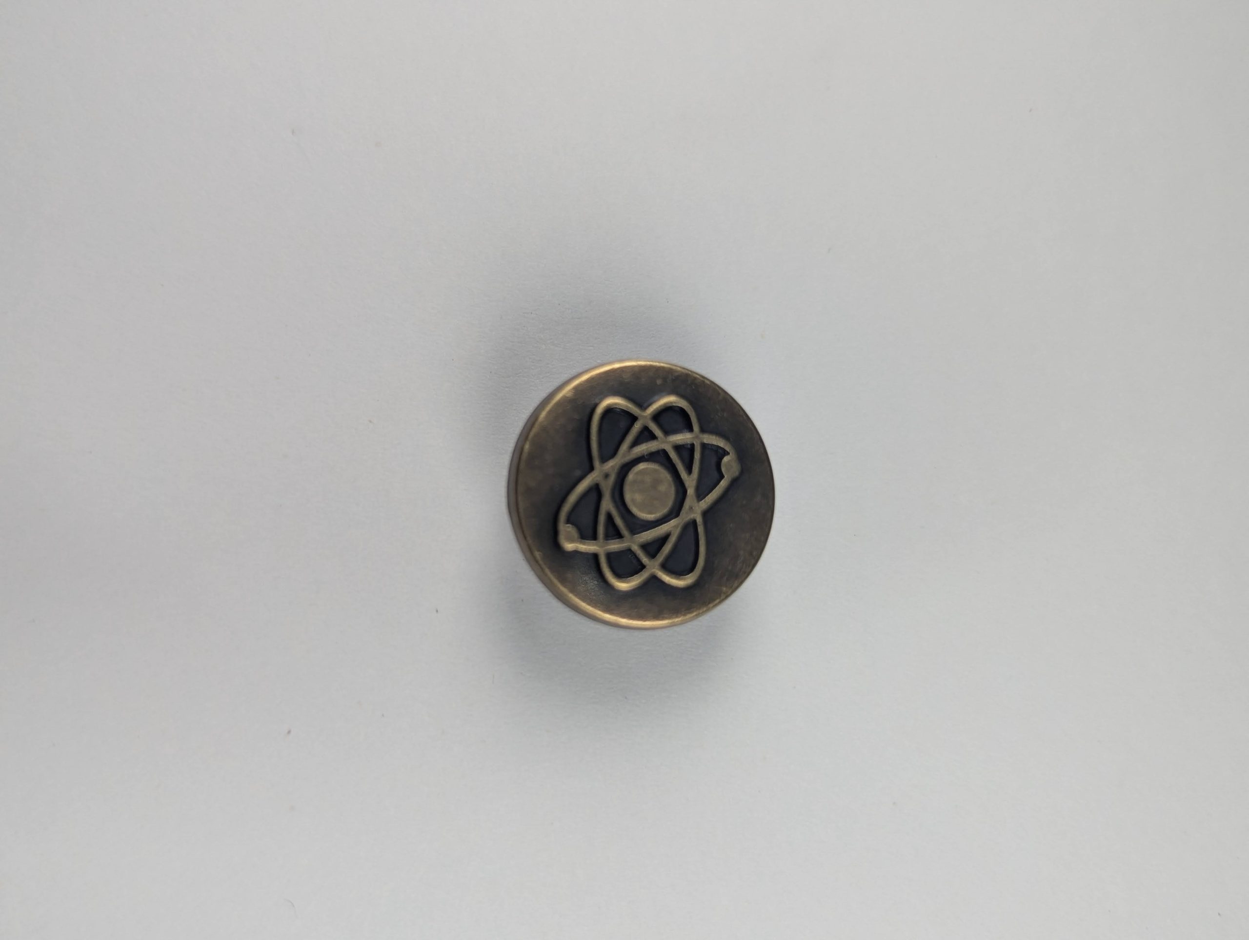 Set of 8 antique bronze metal jean buttons with engraved atom symbol.