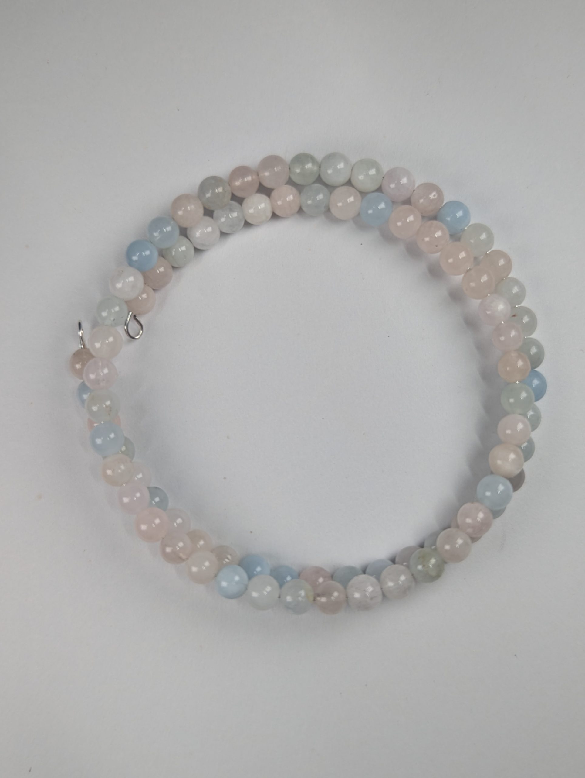A hand-strung morganite gemstone bracelet featuring a mix of gentle pastel colors. Smooth beads and a stretchy fit make it ideal for daily wear and meditation.
