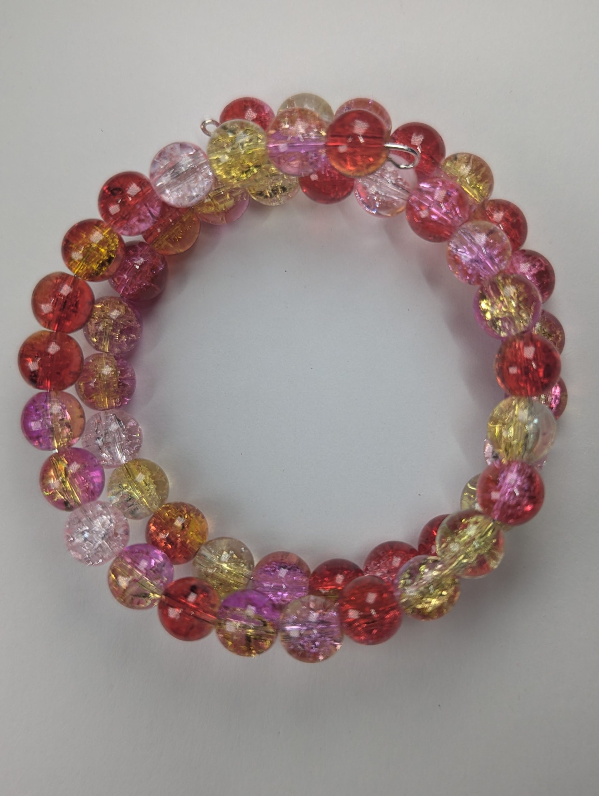A bright multicolor cracked glass bracelet featuring pink, red, yellow, and clear beads. Lightweight, sparkly, and made on a stretchy band for comfort.